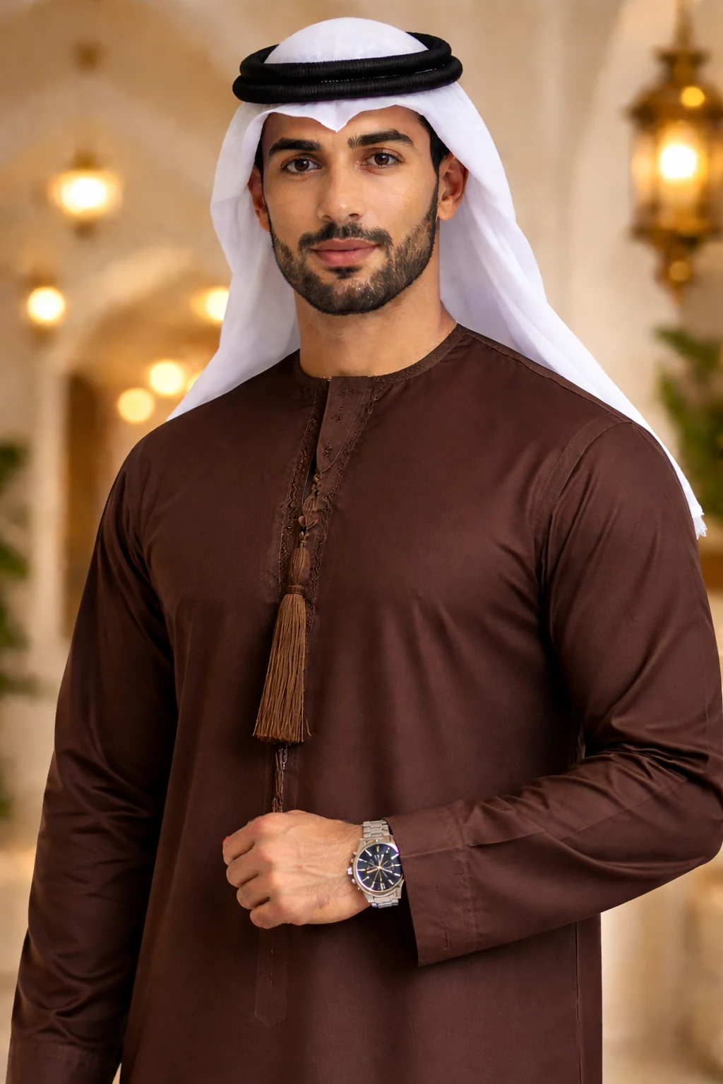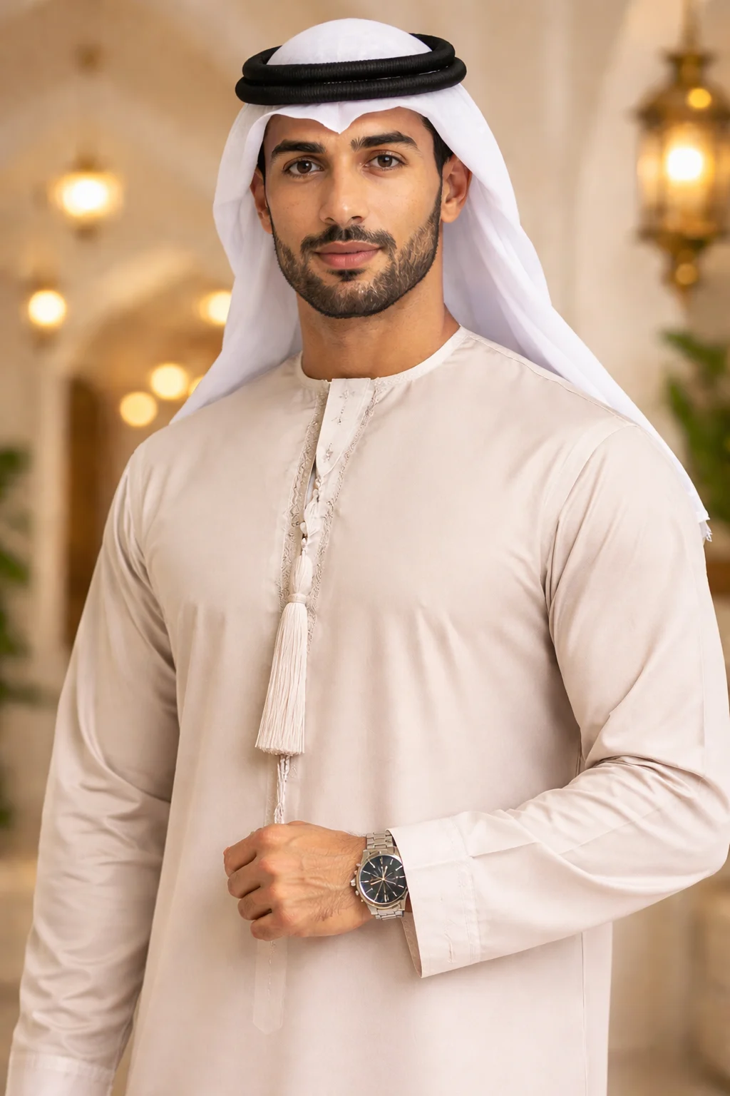 Designed with a clean round neckline, subtle front detailing, and a refined tassel, this kandora reflects authentic Emirati craftsmanship. Its lightweight construction makes it suitable for daily use as well as formal and special occasions.